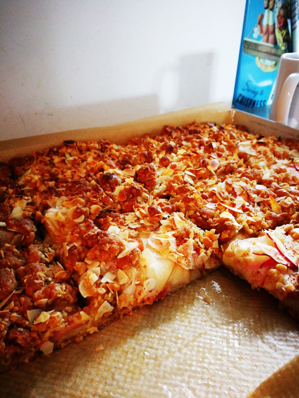 De helft van je havermoutmengsel gaat op de bodem van het bakblik, druk dit goed aan. Droog je appelstukjes af en verdeel deze over de bodem, hierover gaat het amandelschaafsel, als laatste verdeel je het resterende havermoutmengsel over de bovenkant. Beetje aandrukken en in (ongeveer) 30 minuten gaar en bruin bakken. Snij de plaatkoek meteen als deze uit de oven komt, dan is deze nog zacht.